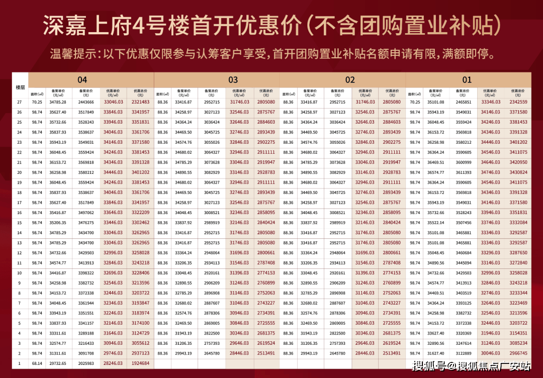 开辟商上海深嘉东置业无限公司地上总建面约14。6万方此中室第组团约4。1万方贸易组团约1万方商办组团约5。1万方(含约1万方商墅)均价总价容积率约2。3物业费3。8/㎡绿化率35%车位约1140个建建楼层27层总户数461户总楼栋4栋开盘楼栋1#4#开盘户数209套交付尺度精拆修交房时间2026。12。31。